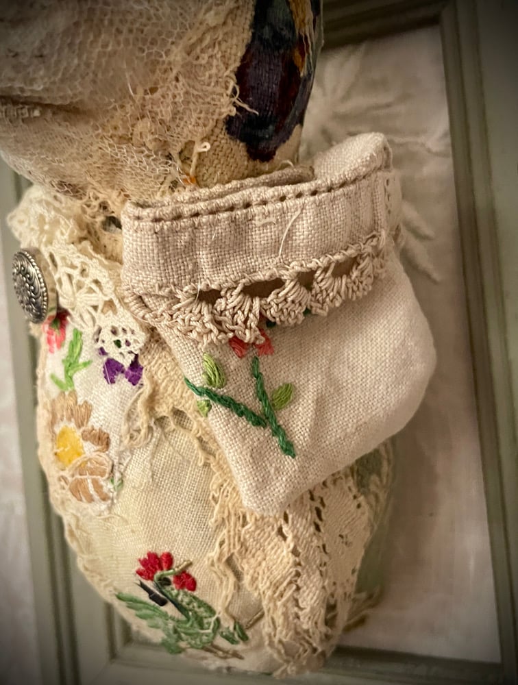 After tea/ coffee and cake, we will mount him on a vintage frame and make his worry pouch using more re purposed textiles.