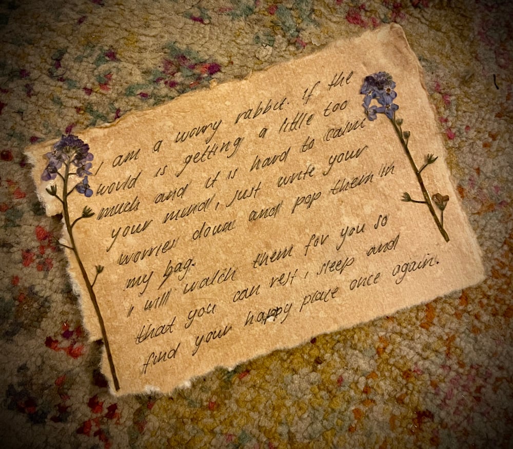 Your worry rabbit will watch over you from your wall and if the world gets a little too much, you can just write your problems down and pop them in his pouch where he will keep them safe so you can feel light again.